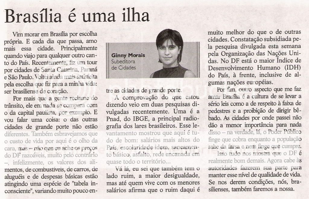 Li e gostei do artigo escrito pela jornalista Ginny Morais do Correio Braziliense. Por este motivo trouxe-o - via scanner e photobucket - para o blog.